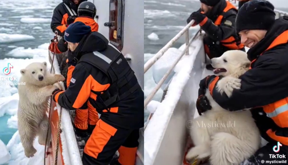 Ένα χαριτωμένο αρκουδάκι πιάστηκε από το σκάφος και ανέβηκε σε αυτό με τη βοήθεια του πληρώματος, μοιράζοντας χαμόγελα στους επιβαίνοντες για την απροσδόκητη αυτή επίσκεψη! Μάλιστα, ήταν τόσο χαριτωμένο και αξιολάτρευτο που οι άνδρες του πληρώματος το πήραν αγκαλιά και έπαιξαν μαζί του.